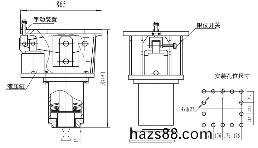 主要設(she)計特點: 常閉式設計、採用(yong)液壓站(zhan)集中驅動控(kong)製以特製碟形彈簧(huang)實現頂軌製(zhi)動; 摩擦塊採用先進的高耐磨鋼,性能可靠; 設有限位開關,顯示工作(zuo)狀態; 帶手動釋放,安裝維護方便。